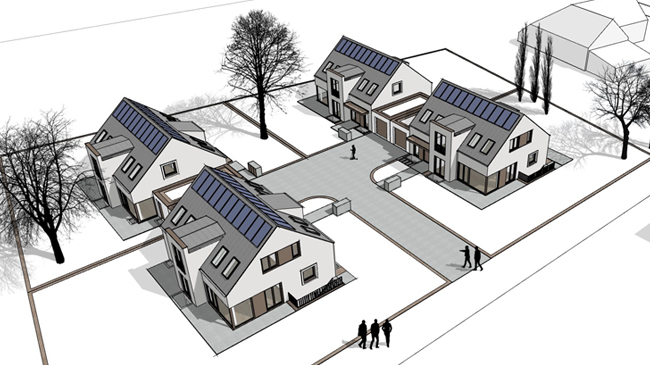 BWW 4 Einfamilienhäuser | LPH 1-4 2022 - Neubau einer Wohnanlage mir vier Einfamilienhäusern und je einer Einzelgarage. Entwurf und Baugenehmigungsplanung im Rahmen der Leistungsphasen 1-4. Baugenehmigung: 2022 Baukosten: ca. 2.400.000,- München | Langwied |