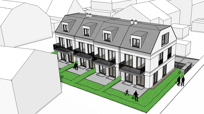 DS56 Reihenhaus-4-Spänner | LPH 1-4 2021-22 - Neubau eines Reihenhaus-4-Spänners, zweier Unterflur-Duplexparkern sowie Abbruch des Bestandes. Entwurf und Baugenehmigungsplanung im Rahmen der Leistungsphasen 1-4. Baugenehmigung: 2022 Baukosten: ca. 1.670.000,- München | Pasing |