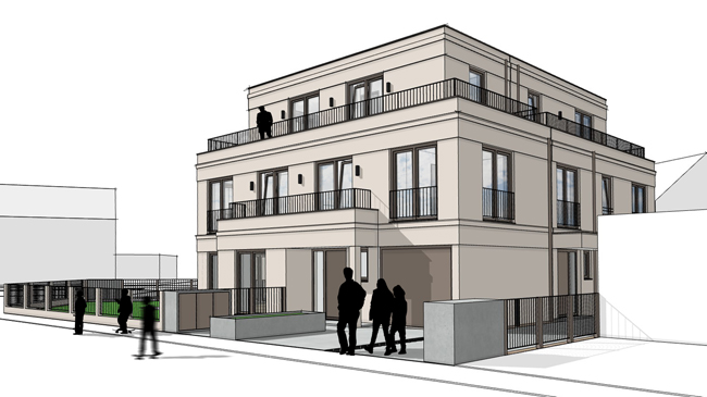 GW 2 3-Fach RH-T | LPH 1-4 2022 - Neubau von 3 Reihenhäuser in T-Anordnung, eines Carports und einer Garage sowie Rückbau des Bestandes. Genehmigungsplanung im Rahmen der Leistungsphasen 1-4. Baugenehmigung: 2022 Baukosten: ca. 1.380.000,- München | Untermenzing |