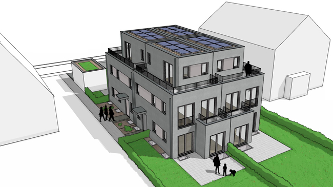 WT 7 Quattrohaus | LPH 1-4 2022 - Neubau eines Quattrohauses mit 4 Reihenhaushälften mit zwei Duplexgaragen sowie Rückbau des Bestandes. Genehmigungsplanung im Rahmen der Leistungsphasen 1-4. Baugenehmigung: 2022 Baukosten: ca. 1.270.000,- München | Aubing |